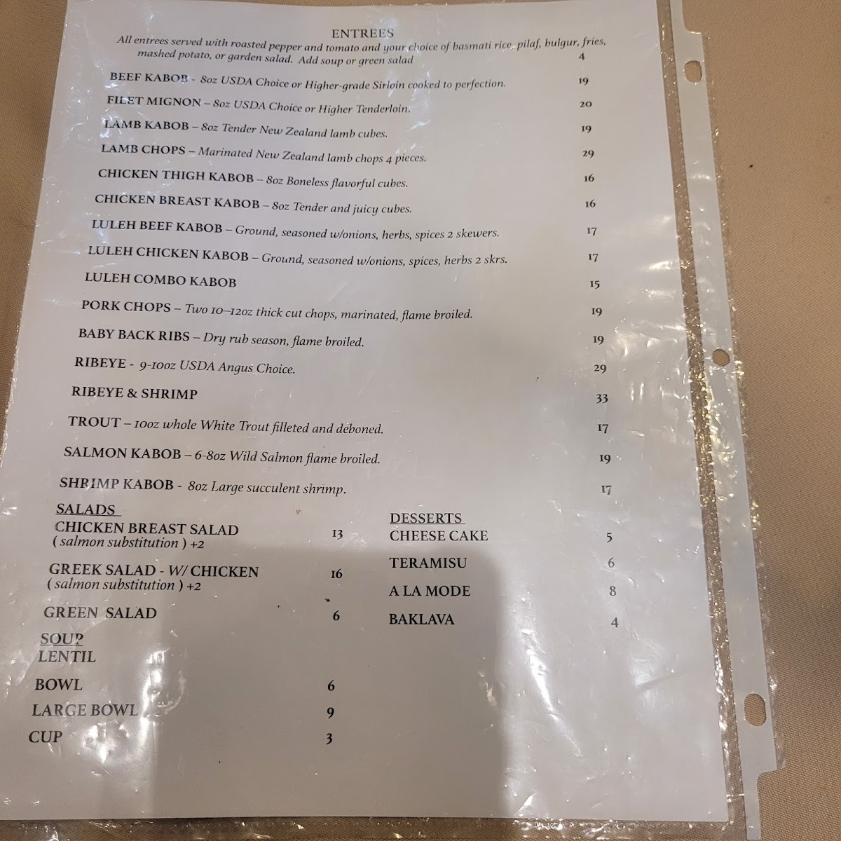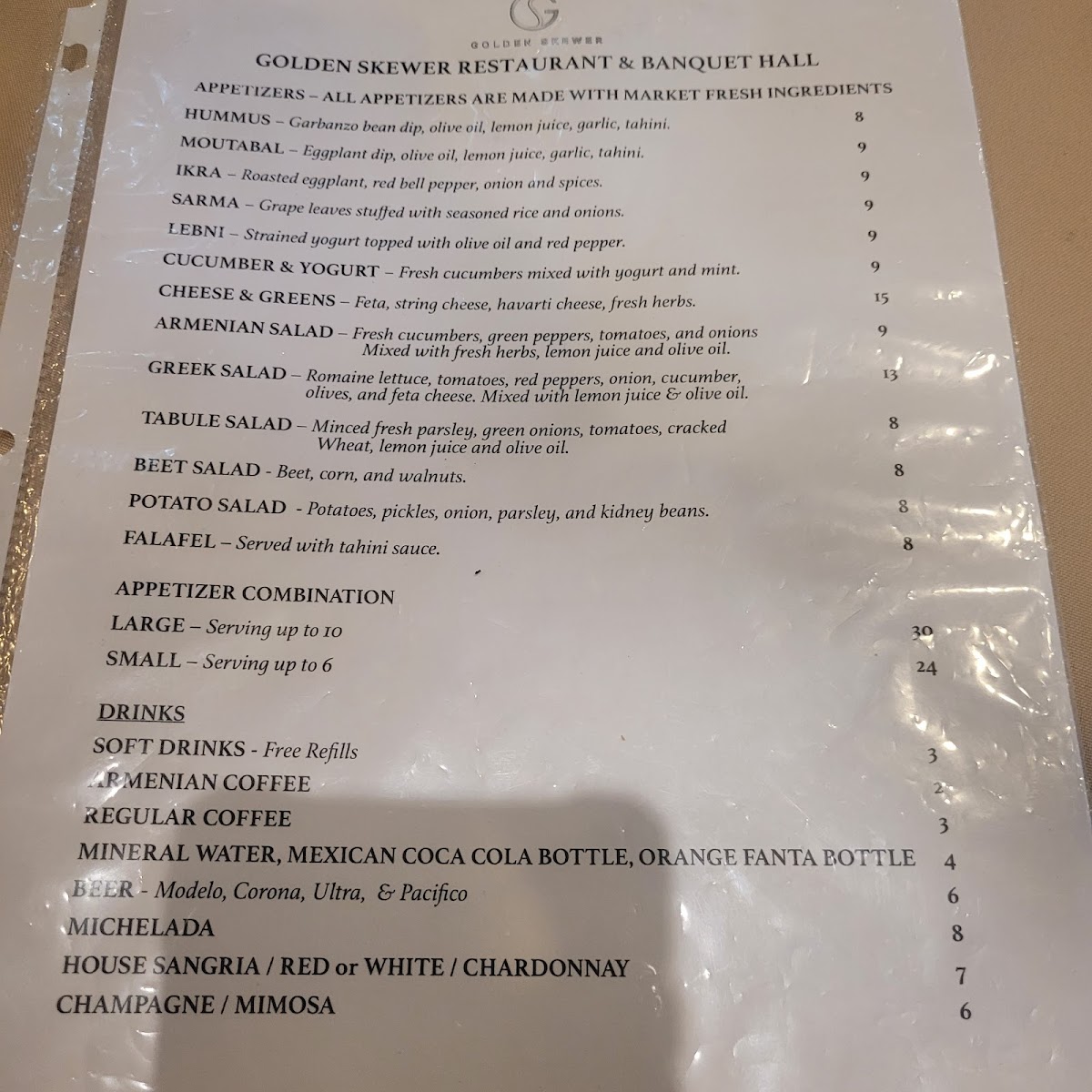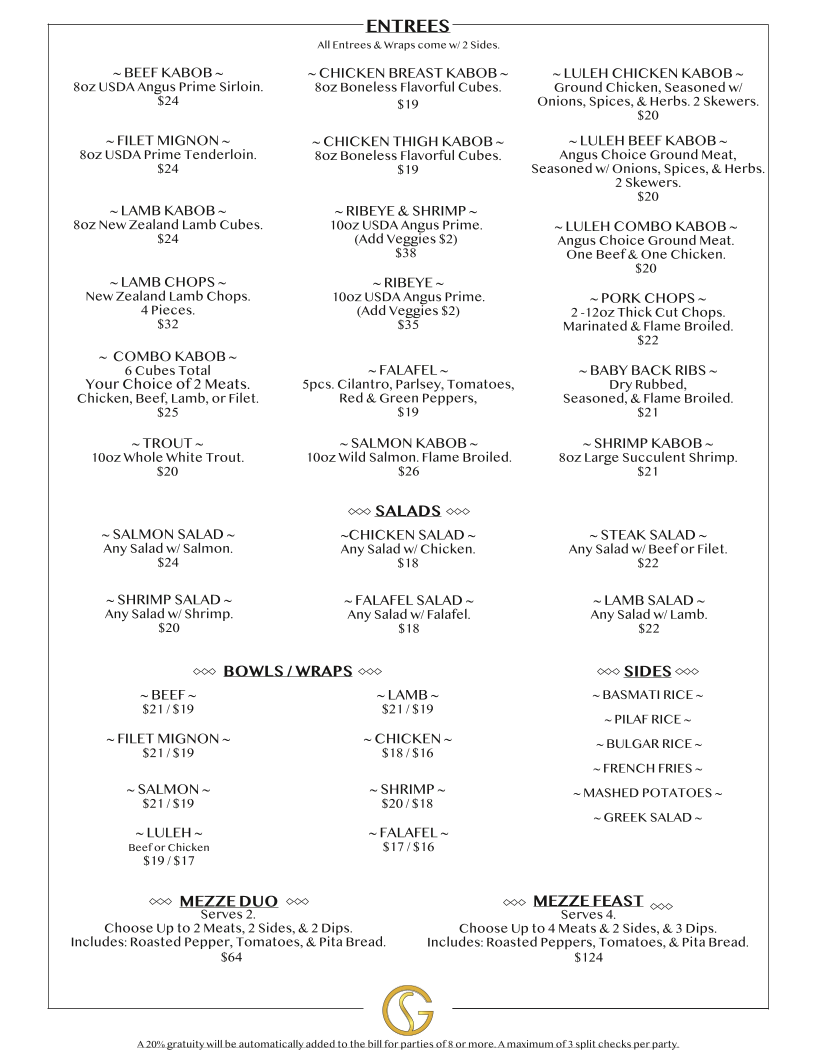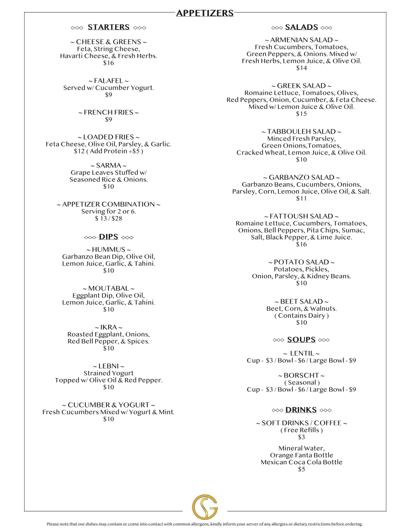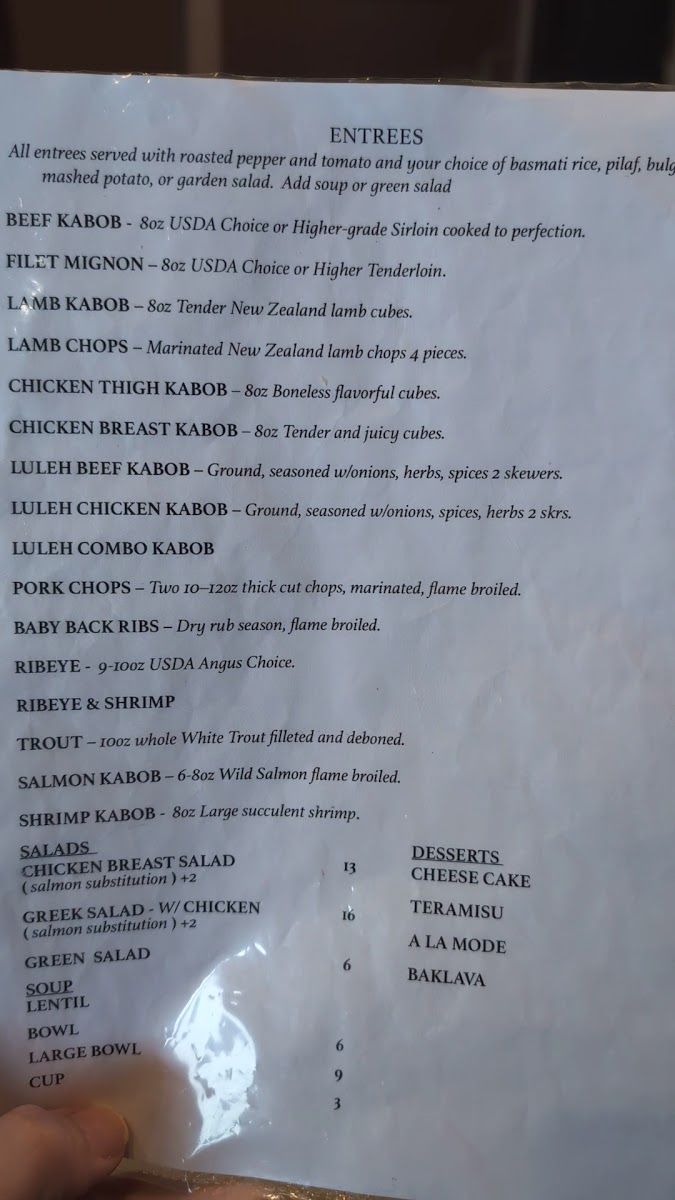 As a final takeaway from my dining experience, the menu at Golden Skewer Restaurant & Banquet Hall, located at 2212 W Beverly Blvd, Montebello, CA 90640, reflects a well-rounded and thoughtfully curated Middle Eastern-inspired offering that balances comfort, tradition, and variety. The meal can easily begin with classic appetizers such as Hummus, Sarma, Moutabal / Baba Ganoush, Ikra, and Lebni, all of which set a flavorful foundation with rich textures and authentic seasoning. Moving into the main selections, the entrees stand out with hearty, grill-focused options like Beef Kabob, Filet Mignon, Lamb Kabob, Lamb Chops, and Chicken Thigh Kabob, each catering to different preferences while maintaining a consistent emphasis on quality proteins. For guests looking for a more casual or customizable option, the bowls-including Chicken Bowl, Beef Bowl, Filet Mignon Bowl, Lamb Bowl, and Luleh Bowl-offer satisfying combinations that feel both filling and approachable. The menu is further complemented by fresh salads such as Chicken Salad, Salmon Salad, Greek Salad, Steak Salad, and Lamb Salad, as well as comforting staples like Lentil Soup. Side dishes including French Fries, Pilaf Rice, Basmati Rice, Bulgur Pilaf, and Side Greek Salad round out the savory selections nicely. To finish on a sweet note, desserts like Tiramisu, Chocolate Torte Cake, and Cheesecake provide familiar indulgence, while beverages range from Soft Drink, Armenian Coffee, Coffee, Mineral Water, and Mexican Coke to alcoholic options for guests 21 and over, such as Modelo, Corona, Stella, Pacifico, and Michelob Ultra. Overall, the menu feels cohesive and complete, making Golden Skewer Restaurant & Banquet Hall a versatile choice for both casual meals and larger gatherings.